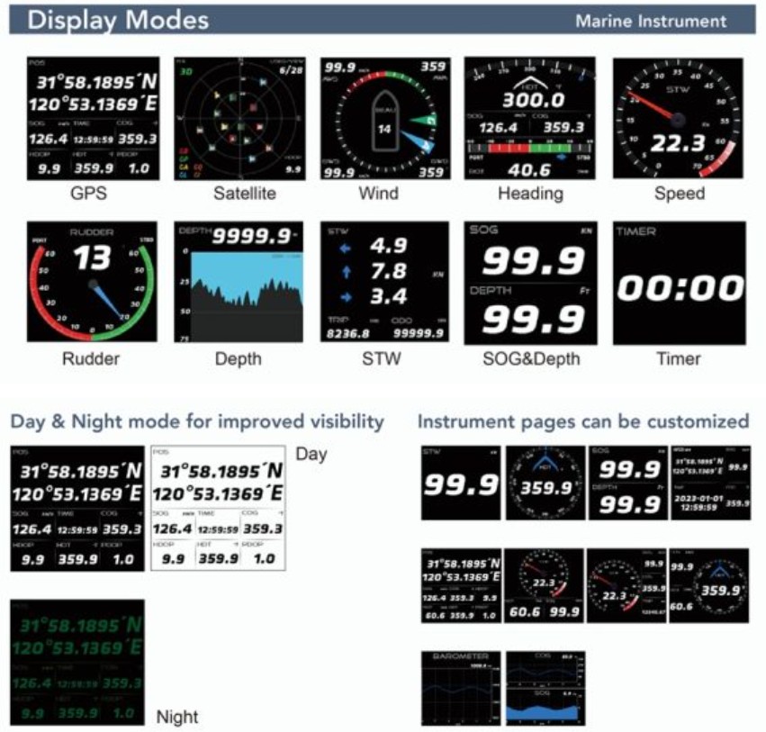 | Displayed Data | GPS, Heading, Depth, Speed, Rudder, Wind, Barometer, Temperature, Humidity, Mileage, Drift |